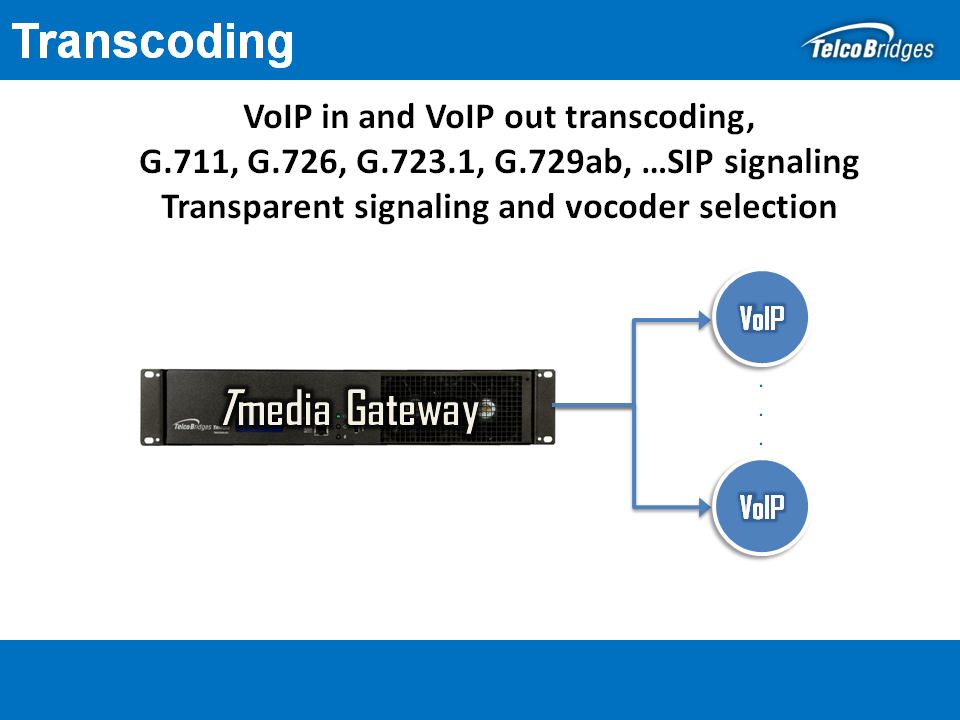 TelcoBridges devices support transcoding among several popular voice codecs whether during calls from TDM-to-IP networks, IP-to-TDM networks or IP-to-IP networks featuring different end-point device capabilities.