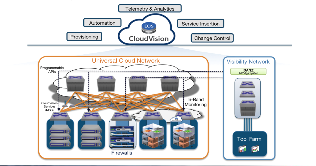 - CloudVision as a single point of control for provisioning, orchestration, and real-time telemetry for both the TAP Aggregation network, as well as the general-purpose data center network infrastructure